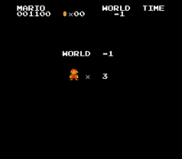 World -1 is nearly identical to world 7-2, except that upon entering the pipe at the end where Mario is brought to the flagpole, Mario is instead sent back to the beginning, making the level uncompletable. However, if a flagpole is hacked into the level it is possible to proceed to world -2.